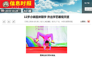 子青表示,他发现不论是跳舞还是练杂技,莫美都展现出的技艺天赋,但由于日常演出太多,子青对莫美的技艺调教时间有限,为了让莫美的天赋能更好地被挖掘,子青今年初把她送到河南一所杂技学校,但是半年下来子青却发现,那所学校在收了学费后,根本没认真对莫美做什么调教。爱才的子青一气之下,就把莫美带回广州,“再累我也要把她的天赋带出来”。