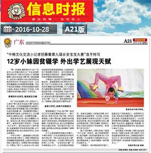 “名莫美,终得分97.3分!”在本月16日信息时报社与广州圣丹福医院联合举办的“中韩文化交流小记者招募暨第九届圣丹福宝宝大赛”第八场选拔赛中,这位名叫莫美的12岁女孩凭借杂技柔术和迈克尔·杰克逊的太空步,以目前初赛高分的成绩晋级到复赛。而这个各项技艺精湛、具有表演才能的小妹妹,却是由于家里过于贫困,不得不辍学并背井离乡来到广州学艺的。